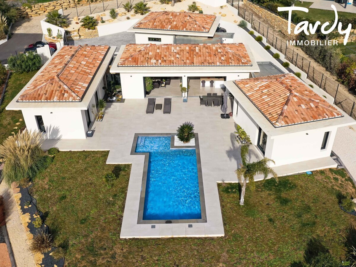 Moderne Villa in Südlage mit Meerblick über die Bucht von Lecques und die provenzalische Landschaft, 6 km vom Strand und Autobahnanschluss entfernt. Ich habe dieses Anwesen von ca. 185 m², komplett auf einer Ebene, in dominanter und ruhiger Lage, Baujahr 2019, ausgewählt, in dem der Indoor-Outdoor-Lifestyle seine volle Bedeutung findet. Auf einem Grundstück von 2070 m² ca. geschlossen und landschaftlich gestaltet, erfordert wenig Wartung, betreten wir das große Wohnzimmer mit ausgestatteter Küche und zentraler Insel, das durch große Erkerfenster mit Backsteintrennwand auf der Terrasse von 160 m² und dem Swimmingpool geöffnet wird. Eine Mastersuite mit Meerblick, italienischem Duschbad, Ankleide und Büro sowie drei weitere Schlafzimmer mit Duschbad und Badezimmer bilden die Schlafbereiche. Große Garage für 4 Autos, die auch Platz für eine Werkstatt/Lagerung lässt. Ummantelte reversible Klimaanlage. Automatische Bewässerung, Wasser aus dem Canal de Provence. Petanque-Platz. Situation, Perspektiven und Nutzen sind da. Einwandfreier Zustand. Der Preis beinhaltet Vermittlungsgebühren in Höhe von 5 % inkl. MwSt., die vom Käufer zu zahlen sind. Philippe PICHERY Unabhängiger Handelsvertreter RSAC Toulon: 811 740 786 33 (0)6 63 04 00 66