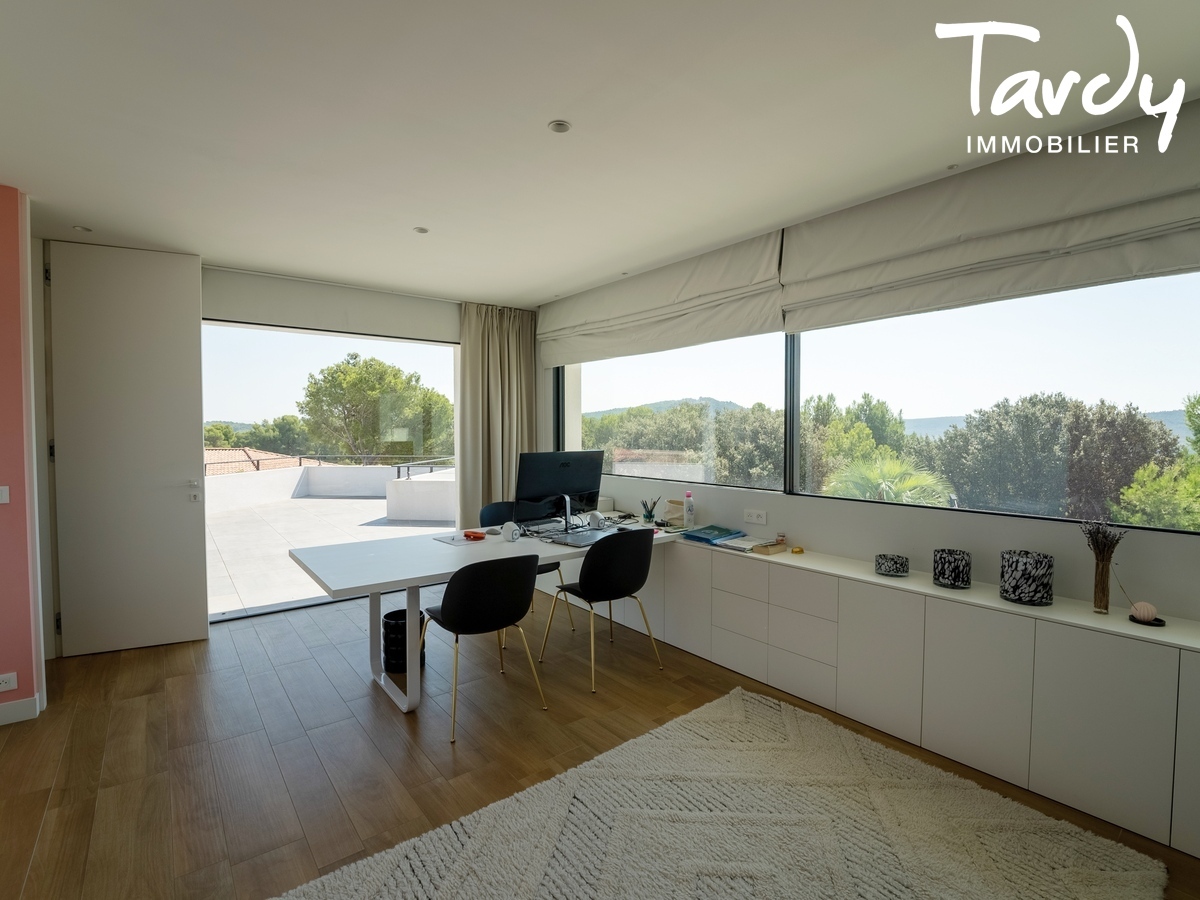 Les espaces de vie sont très bien pensés, avec un espace bureau d'une cinquantaine de m2 à l'étage ainsi que 3 autres chambres, toutes donnant sur de magnifiques terrasses à la vue époustouflante.